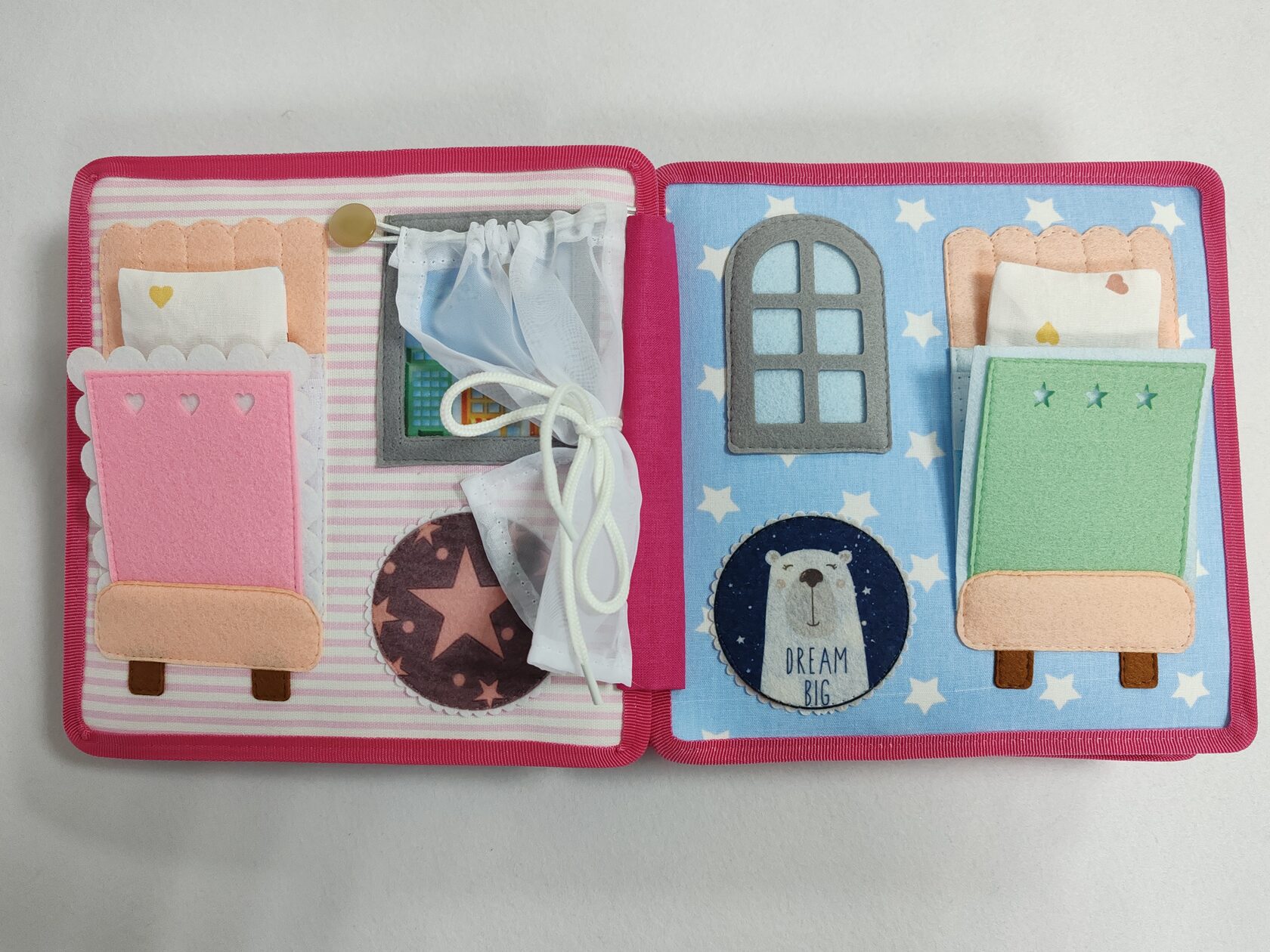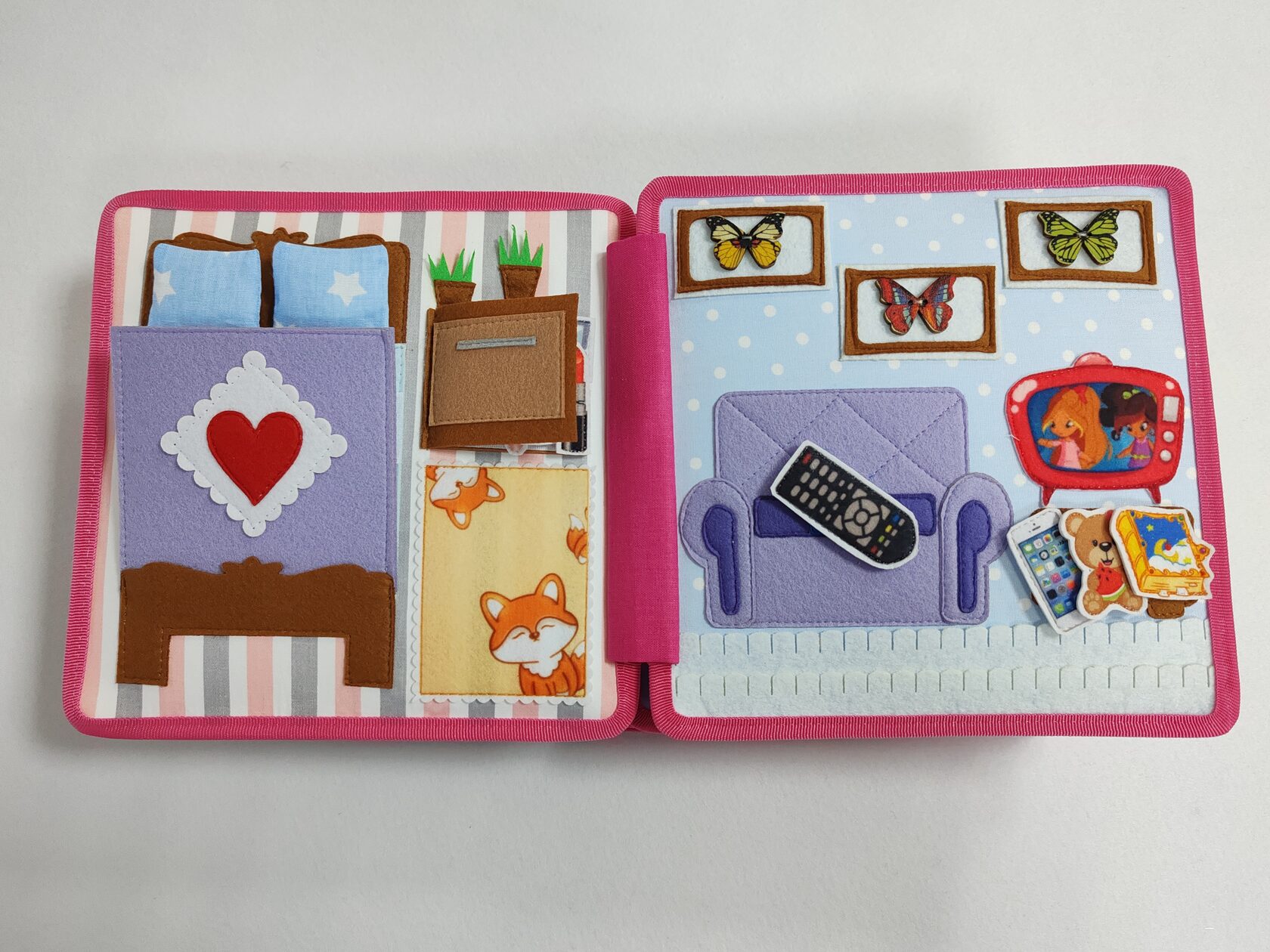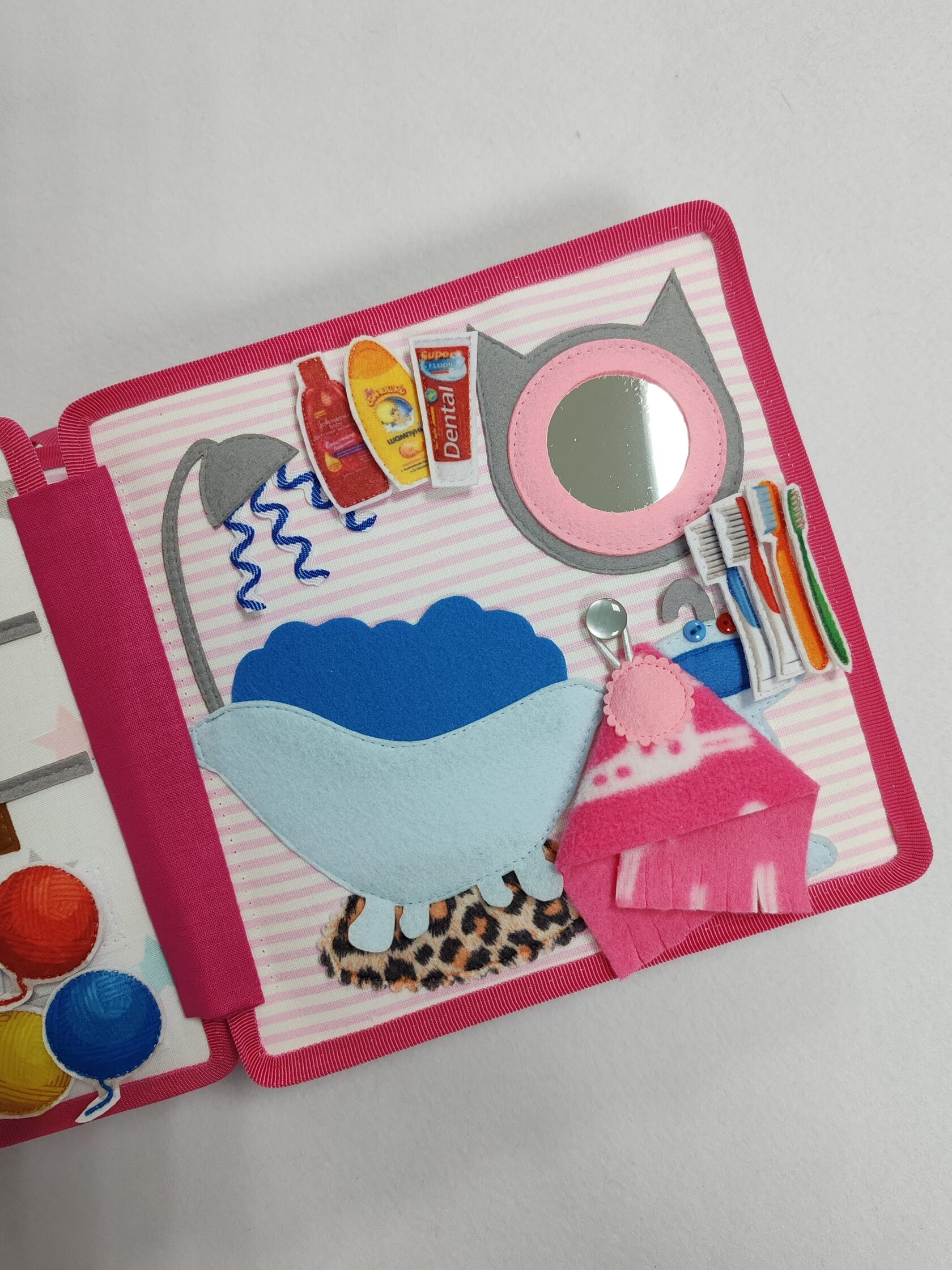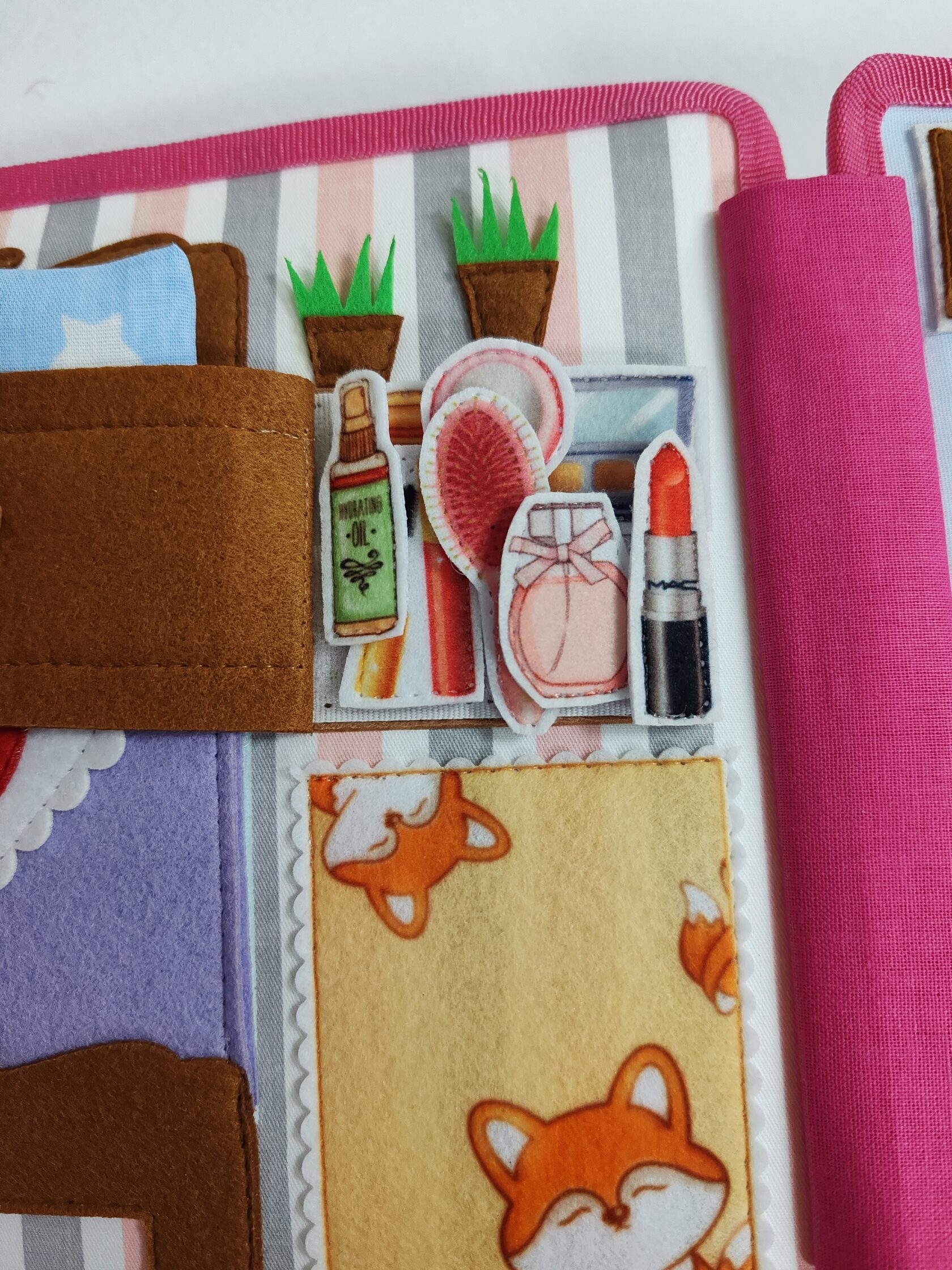 В неё вошли разнообразные игры: — шнурки — молнии — липучки — кнопки — пуговицы — кто в домике живет — сравнение большое/маленькое -и специально для девочек: безопасное зеркало и красная помада, чтобы быть маленькими принцессами и не брать помаду мамы))