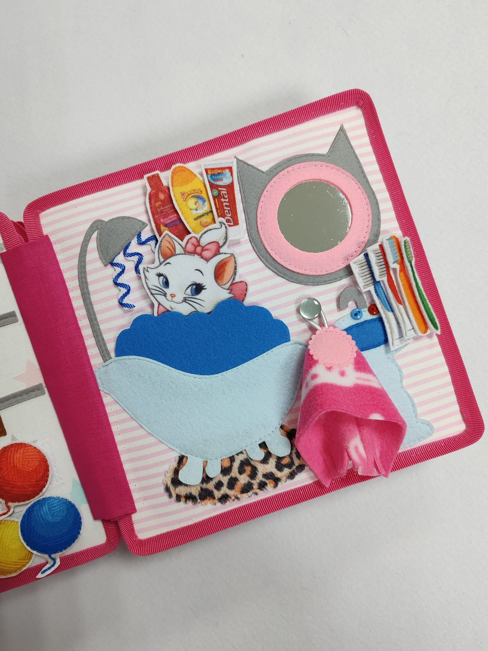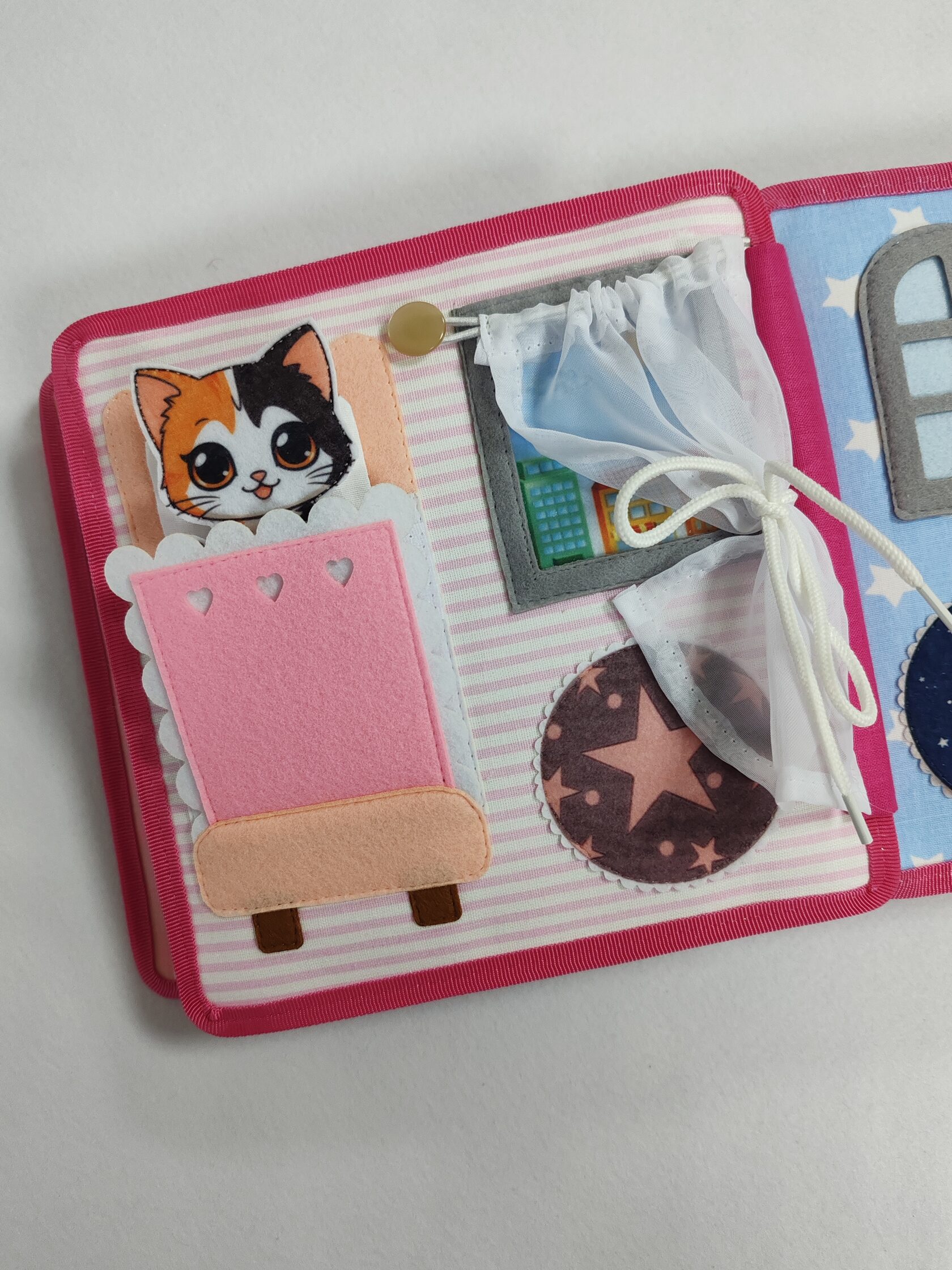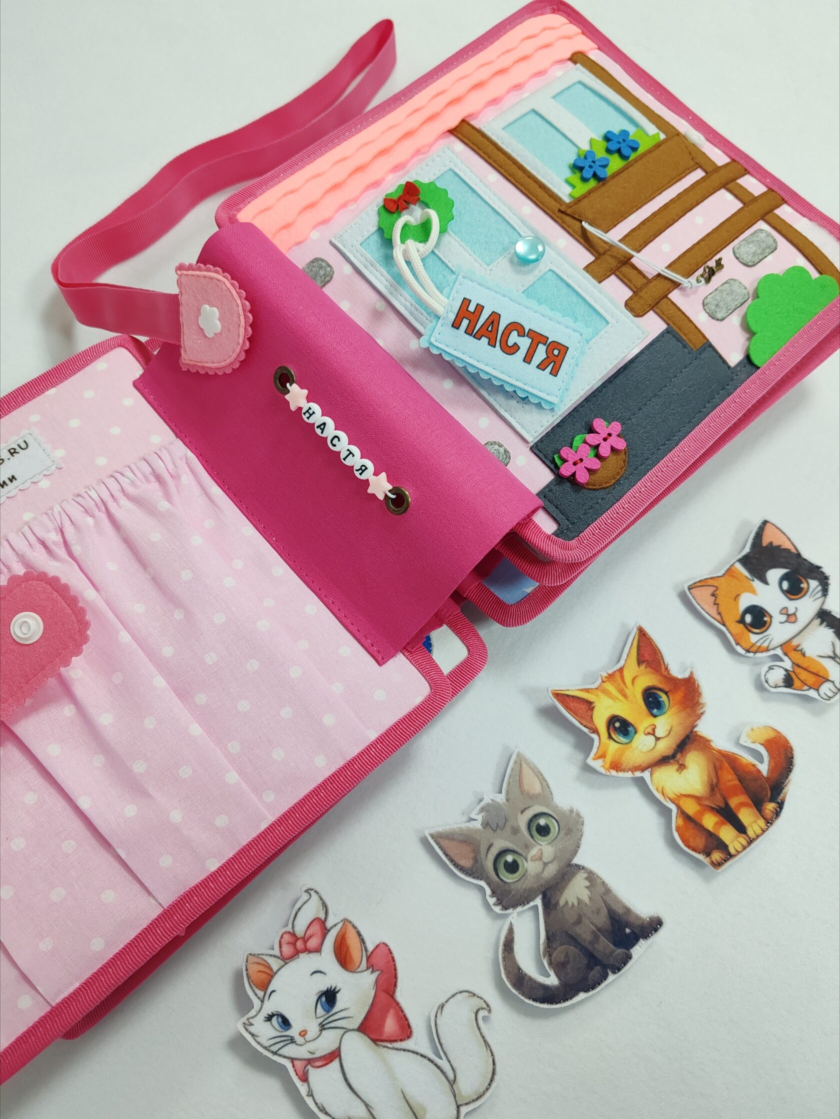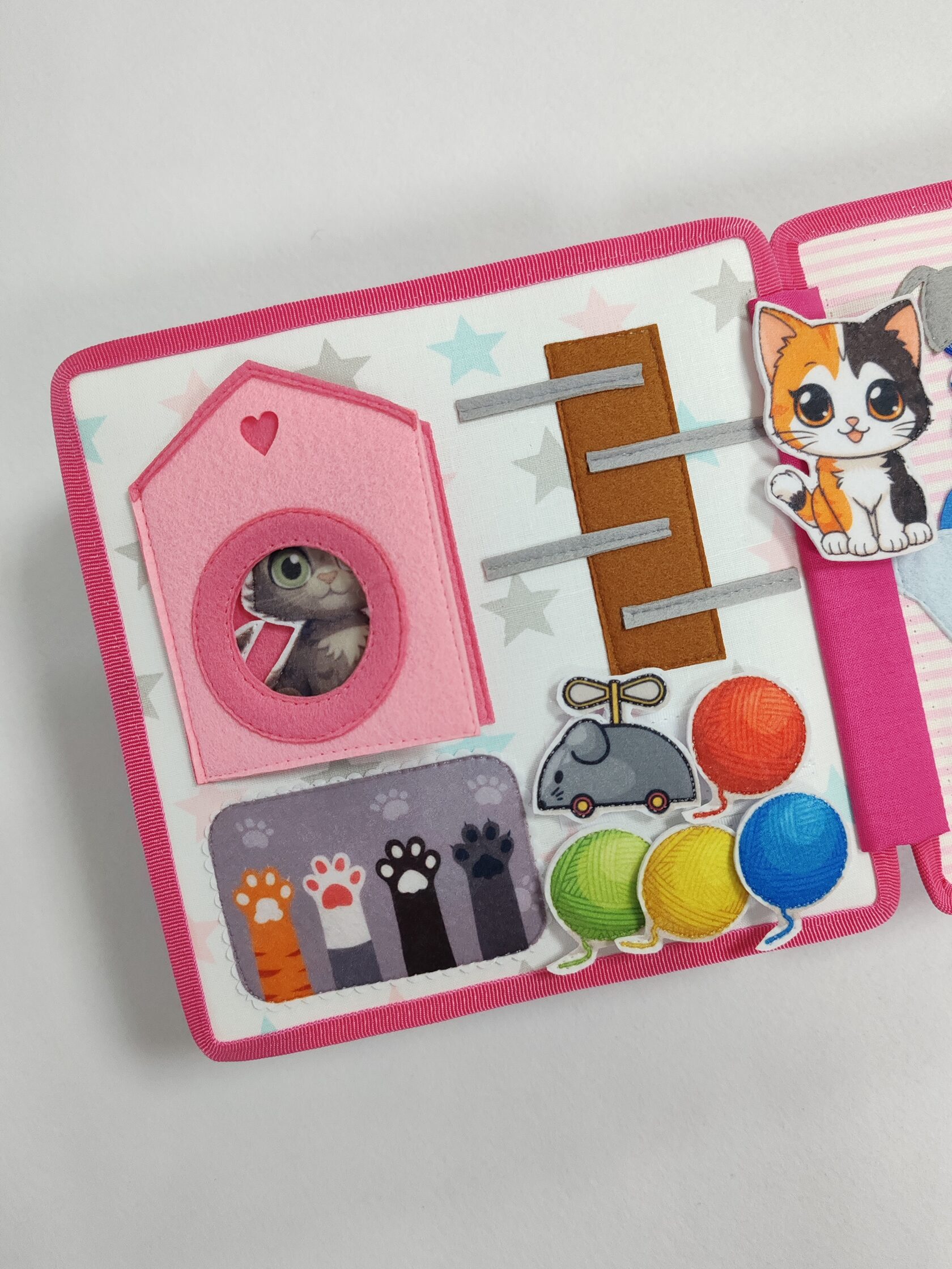 В неё вошли разнообразные игры: — шнурки — молнии — липучки — кнопки — пуговицы — кто в домике живет — сравнение большое/маленькое -и специально для девочек: безопасное зеркало и красная помада, чтобы быть маленькими принцессами и не брать помаду мамы))