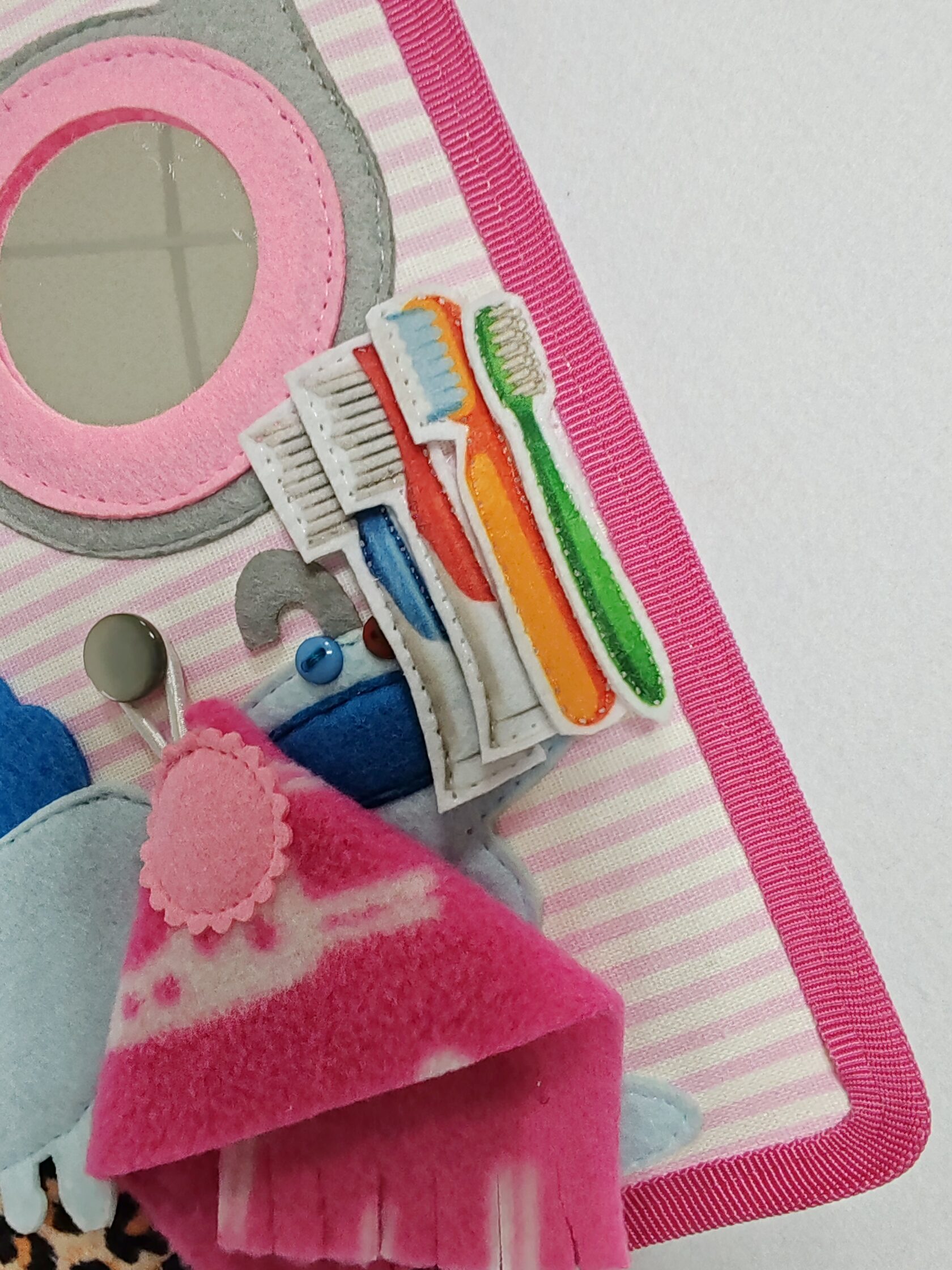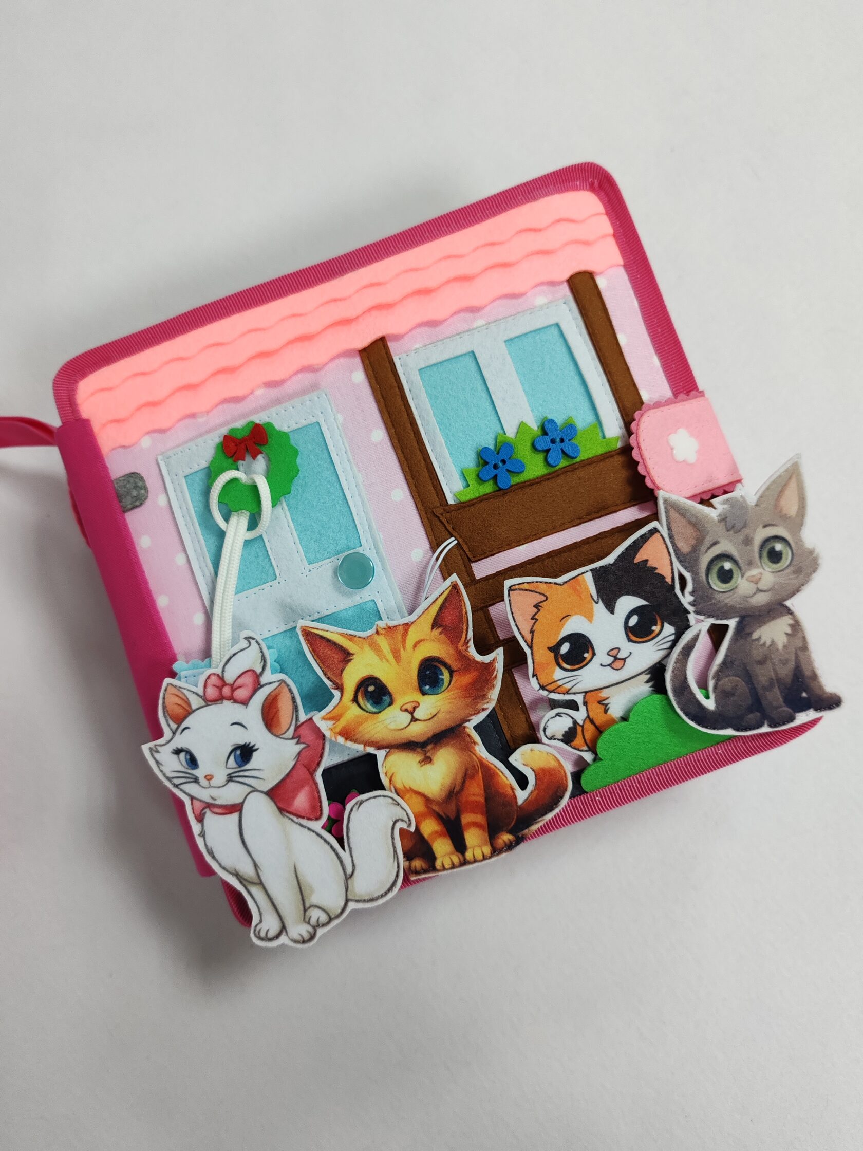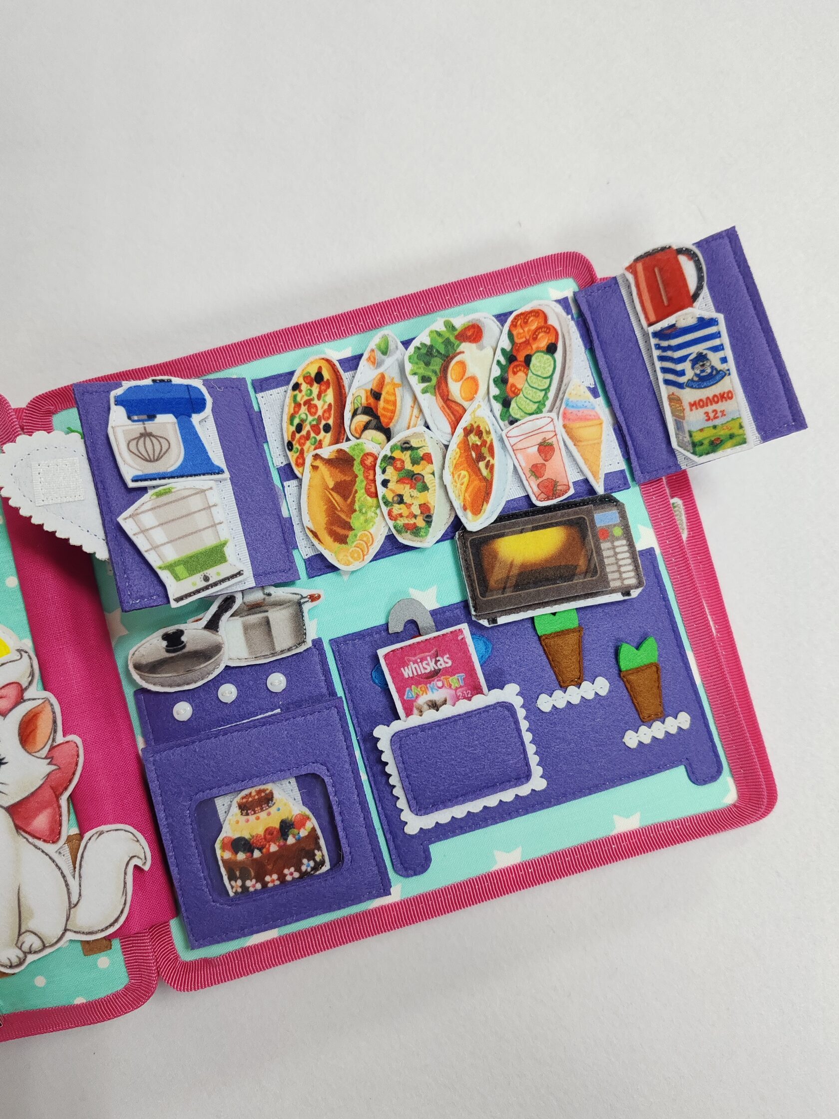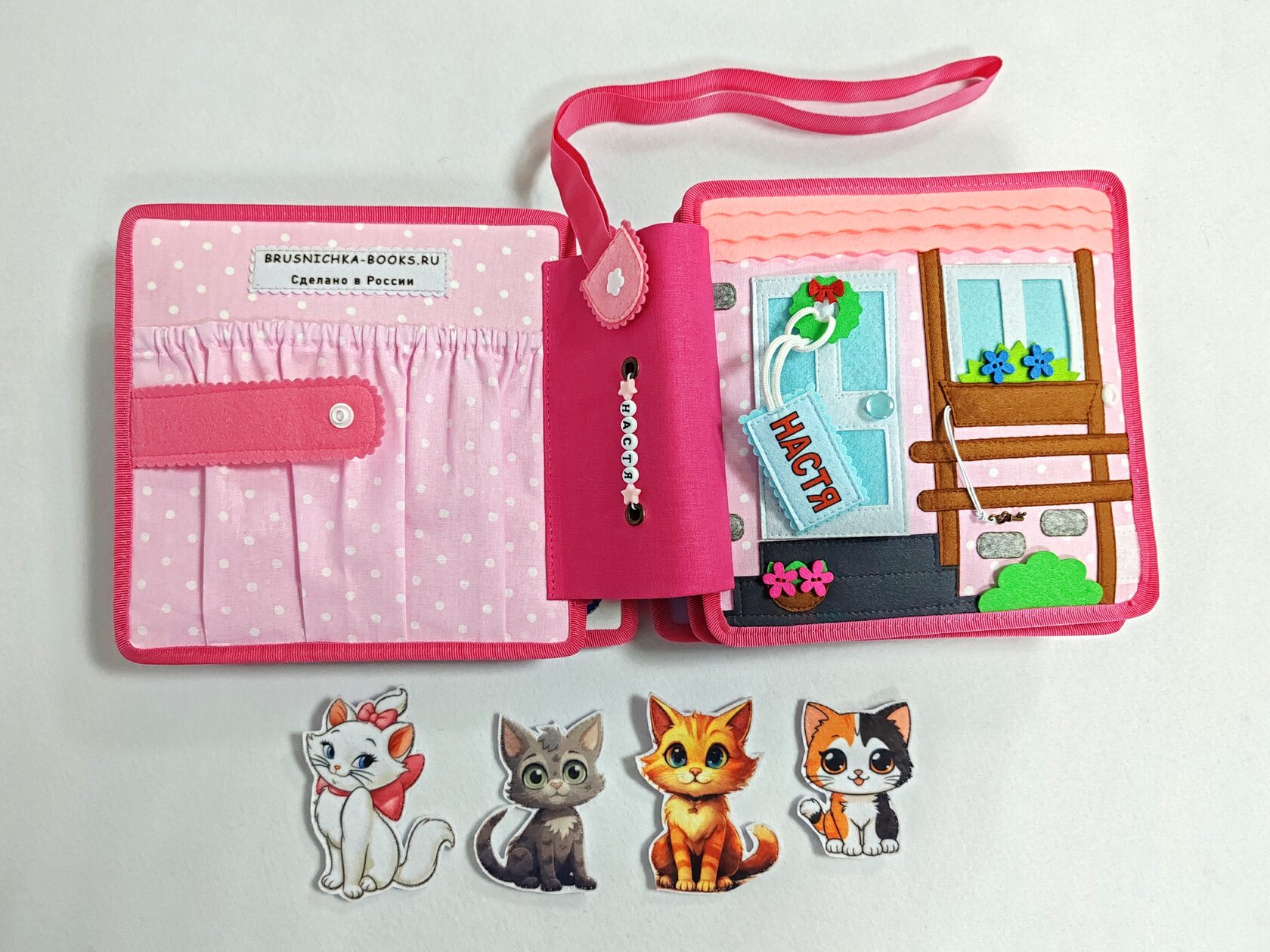 В неё вошли разнообразные игры: — шнурки — молнии — липучки — кнопки — пуговицы — кто в домике живет — сравнение большое/маленькое -и специально для девочек: безопасное зеркало и красная помада, чтобы быть маленькими принцессами и не брать помаду мамы))