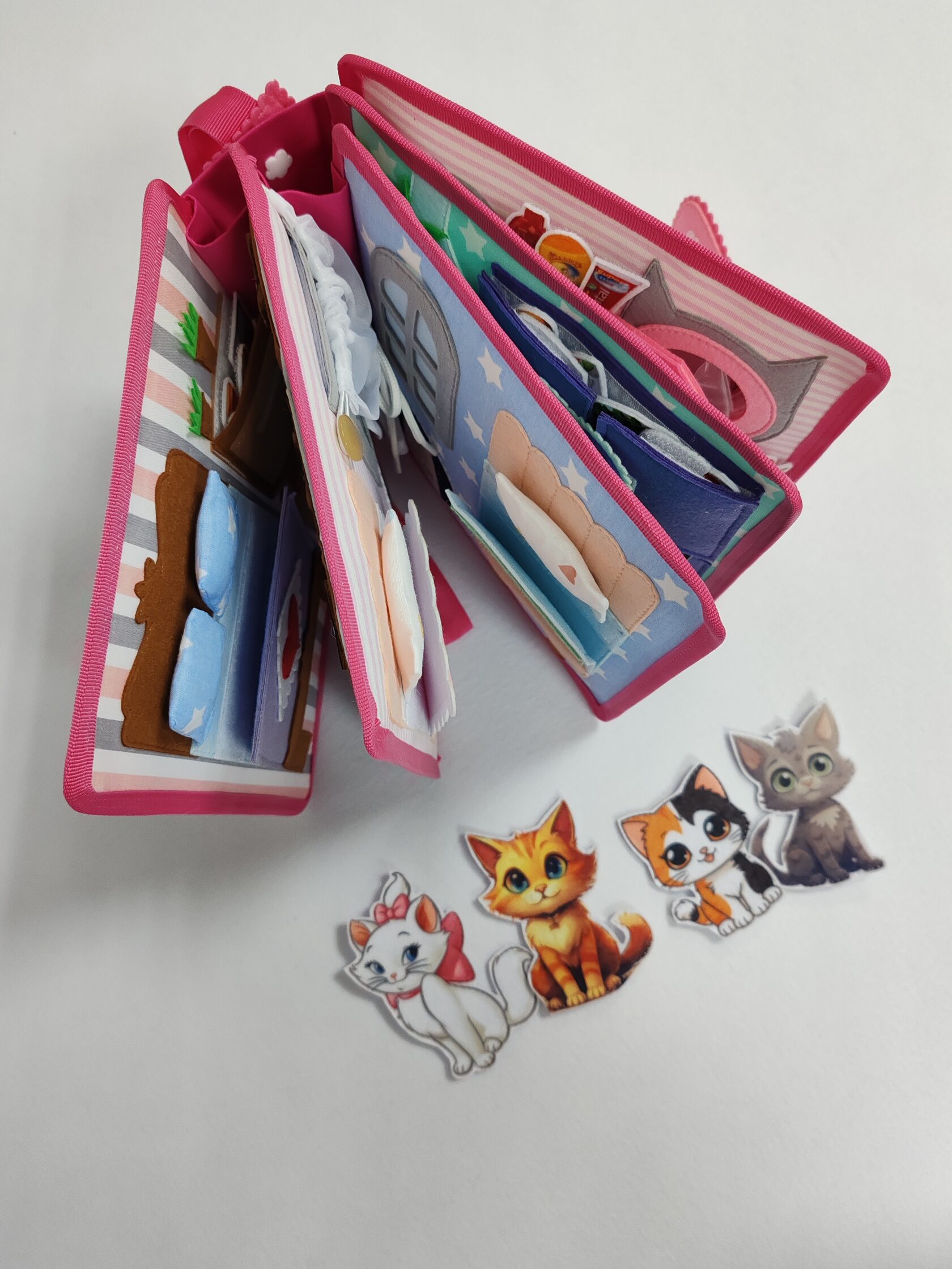 Семья из 4х кошек: мама, папа, дочка, сын. У каждого персонажа свой набор вилок/ложек, своя чашка, своя зубная щетка. Три спальни: родителей и отдельные у детей. Игровая, кухня, столовая, ванная, гостиная.