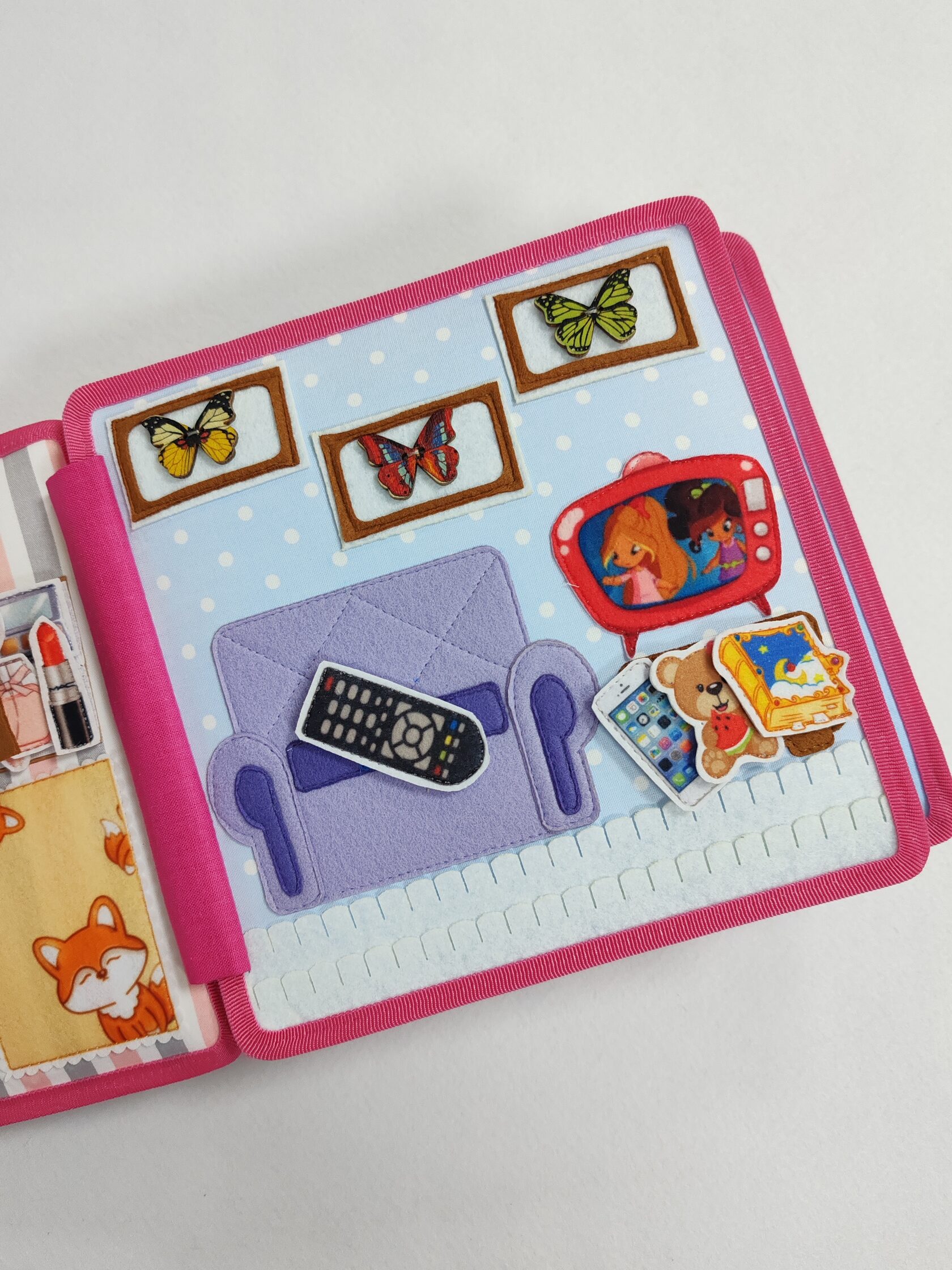 Размер 20×20 8 страниц: крыльцо, спальня, гардероб, столовая, кухня, ванная комната... Много одежды, еды, различных предметов и даже настоящие вилка и ложка. Компактный размер, небольшой вес книжки и удобный ремешок позволит брать ее с собой куда угодно. ПО ПОЖЕЛАНИЯМ КЛИЕНТОВ ПЛЮСОМ ДОБАВЛЕНЫ: НАСТОЯЩЕЕ АКРИЛОВОЕ ЗЕРКАЛО, ПОЛОТЕНЦЕ, ПЫЛЕСОС, ФЕН, КЛЮЧИК ОТ ДВЕРИ И ДОПОЛНИТЕЛЬНАЯ КУКОЛКА (ТЕПЕРЬ ИХ ДВЕ: БРЮНЕТКА И БЛОНДИНКА) !